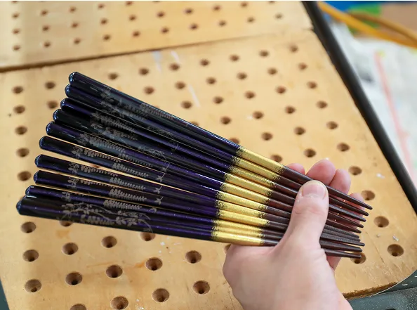 お箸に柄をつける工程を担当しています。私の担当する工程はすべて手作業となっており、2種類の塗料や柄を重ねたり、ぼかしたりと、さまざまな表現方法でお箸に色や柄をつけていきます。